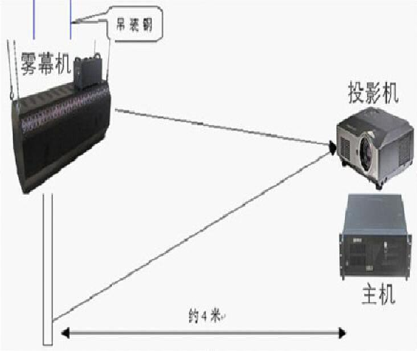 霧幕投影系統主要由投影機、霧屏發生器、水箱、計算機、控制器、全息演示內容以及一些輔助設備,例如線材等。